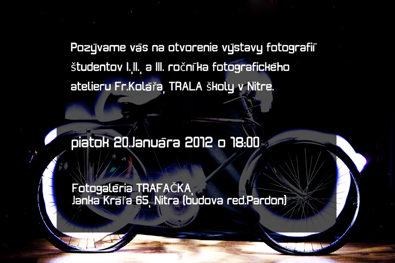 V piatok 20. januára 2012 o 18:00 hod. sa v nitrianskej fotogalérii Trafačka uskutoční otvorenie výstavy fotografií študentov I., II. a III.ročníka fotografického ateliéru F.Kolářa Tralaškoly v Nitre. Výstava je zameraná na fotogram, luminografiu a voľnú tvorbu.
