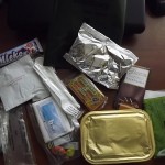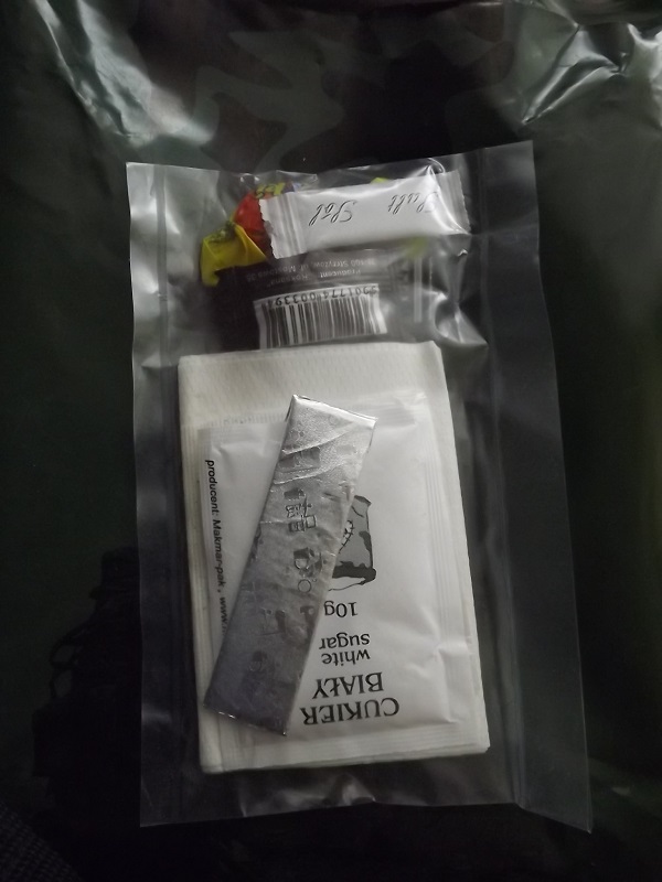 Obsah jedného balíčka tvorí: bezplamenný ohrievač, hlavné jedlo (fazuľa s klobásou), paradajková polievka, čokoláda, sušené ovocie, špeciálne sušienky, sladené kondenzované mlieko, bonbón s extraktom z kávy, bonbón s vitamínom C, žuvačka, cukor, instantný čaj, lyžica, vidlička nôž, igelitové vrecko, navlhčený obrúsok, zápalky, toaletný papier, soľ, korenie, instantný citrónový nápoj, voda na bezplamenný ohrievač.